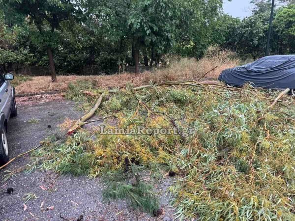 Η ισχυρή ανέμωση προκάλεσε την πτώση δέντρου σε πάρκινγκ στο Στρατόπεδο Τσαλτάκη, με τα σπασμένα κλαδιά να χτυπούν δύο σταθμευμένα αυτοκίνητα, σύμφωνα με το lamiareport.