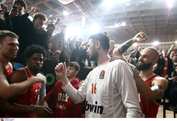 Οι παίκτες του Ολυμπιακού πανηγυρίζουν με τους φιλάθλους την κατάκτηση της πρώτης θέσης στη #Euroleague