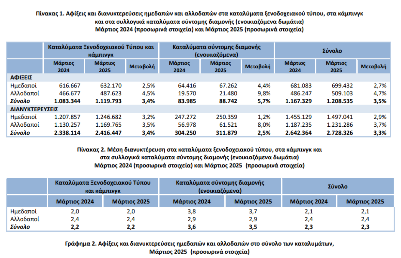 Specifically, preliminary data obtained from ELSTAT indicates that in March 2025, there was a 4.7% rise in arrivals and a 3.7% rise in overnight stays among foreign visitors compared to March 2024.